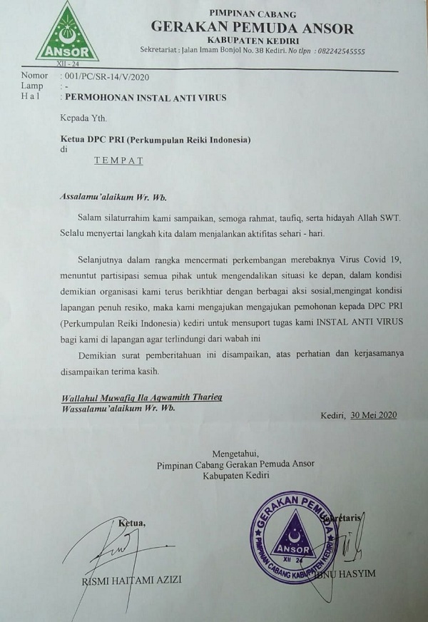 Surat permohonan itu dilayangkan oleh Ketua GP-Ansor Kabupaten Kediri. "Mengingat kondisi lapangan penuh resiko, maka kami mengajukan permohonan kepada DPC PRI Kediri untuk mensuport tugas kami (dengan) instal antivirus bagi kami di lapangan agar terlindungi dari wabah ini," demikian tulis Rismi Haitami Azizi, Ketua GP-Ansor Kediri, dalam surat tersebut. Instalasi kemampuan terapi Bioantivirus diberikan oleh Ketua DPC PRI Kediri, Fadholi.