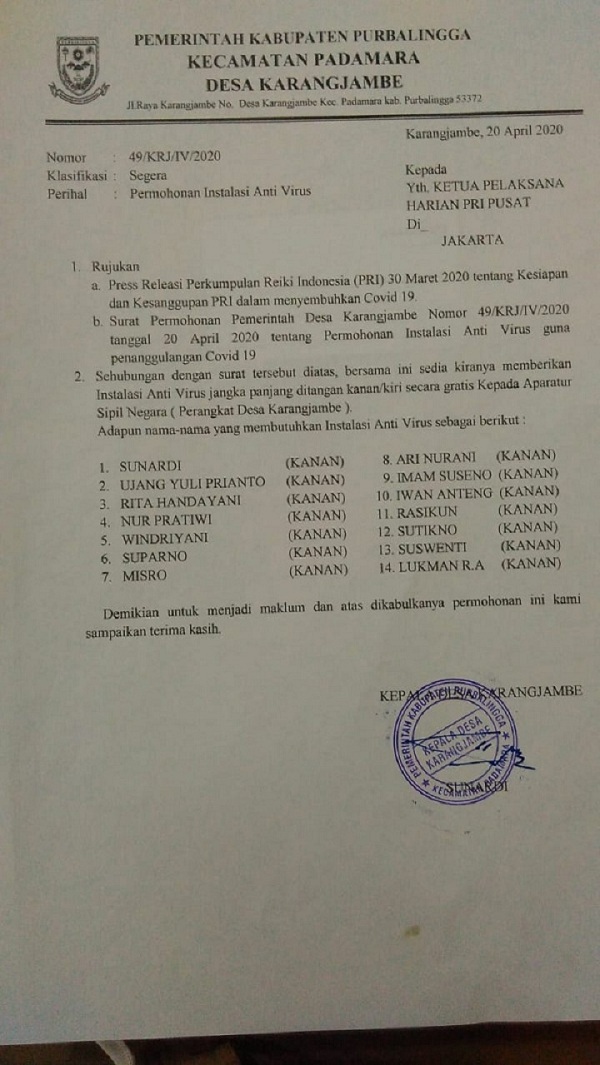 Permintaan Install BioAntivirus dari Pemerintah Desa Karangjambe, Kecamatan Padamara, Kabupaten Purbalingga. Sebanyak 14 orang jajaran Perangkat Desa Karangjambe di-install untuk jangka waktu 3 bulan. Instalasi ini diharapkan dapat membantu Pemerintah Desa dalam mengatasi pandemi corona virus terutama di wilayah desa Karangjambe.