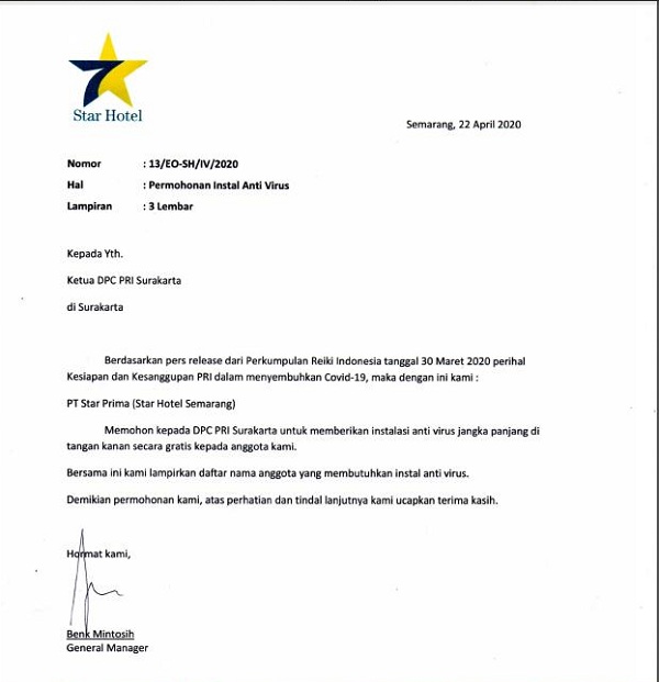 Permintaan Install BioAntivirus dari Star Hotel, Semarang, untuk jajaran manager dan seluruh karyawan hotel sebanyak 72 orang. Install dilakukan oleh Ketua Pelaksana Harian DPP PRI, Irwan Effendi. Dengan kemampuan terapi ini, mereka dapat menerapi diri sendiri dan tamu-tamu hotel yang akan menginap. Harapannya, lingkungan hotel bebas dari virus corona (Covid-19), para tamu hotel pun menginap dengan nyaman tanpa kuatir terinfeksi virus.